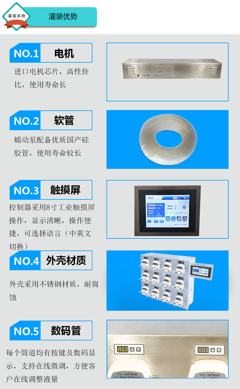 1.灌裝系統由5組基本通道,通道數量可定制(可擴展至32通道),一臺控制器組成,可安裝YZ15、YZ25泵頭