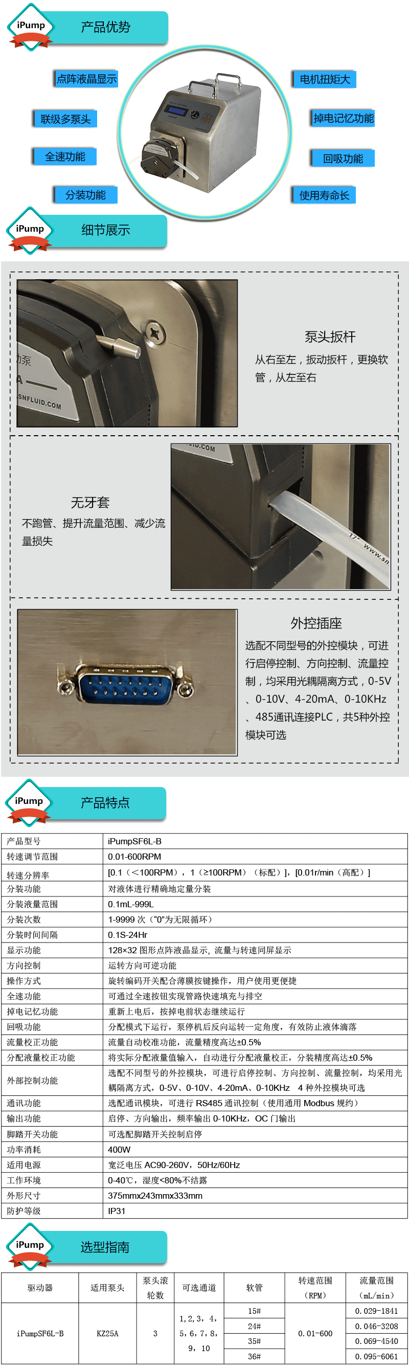 1.流量范圍:0.029-6061mL/min 2.兩種工作模式,流量模式與分配模式可選 3.具有流量校正、分裝液量校正功能 4.分裝精度高達±0.4%以內 5.采用伺服電機驅動,控制準,動力強勁 6.線路板全部三防漆處理,防腐、防潮